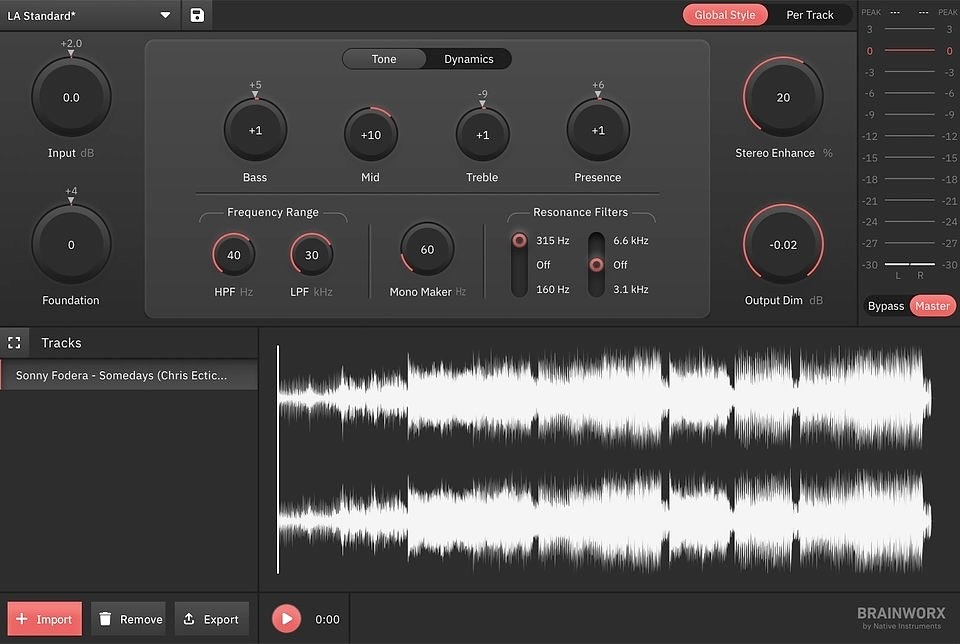 bx_mastering studio的使用流程非常简单:导入你想要进行母带处理的音轨,然后选择11种预设风格中的一种即可。之后,你可以通过软件的音色(Tone)和动态(Dynamics)标签页,对声音进行细致调整。