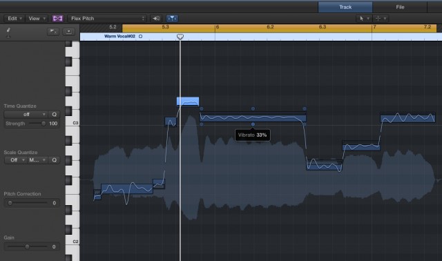 Apple的弹性时间(Flex Time)功能已经很强大了,但当你可以自由操纵音频的时值时,你就会想要调整它的音调。弹性音调(Flex Pitch)就是为此而生的,在它的界面上可以调整单音的音调,跟Celomony Melodyne这类插件一样。同样,这一点需要向Logic的竞争者Cubase致以敬意,是它们最早实现的。这个功能的用户界面特别漂亮,获得的结果也是很整洁的,而且易于掌握。